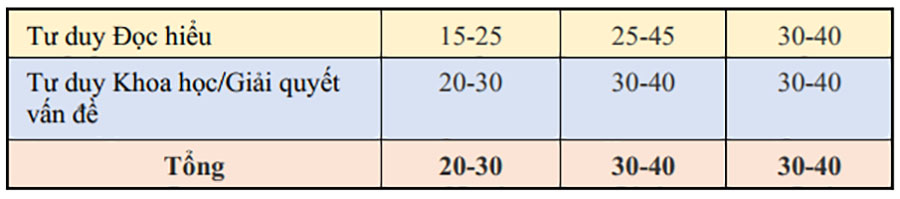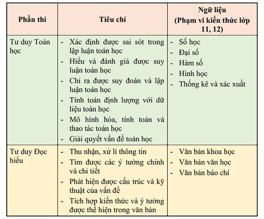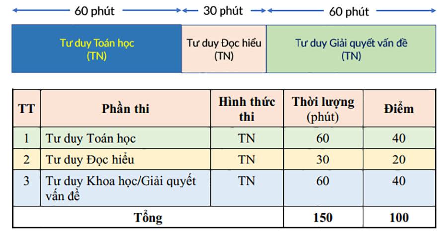 Theo đó, tổng thời gian của bài thi gồm 150 phút cho 3 nội dung thi gồm: Tư duy Toán học (60 phút), Tư duy Đọc hiểu (30 phút) và Tư duy Giải quyết vấn đề (60 phút) với hình thức thi là hoàn toàn Trắc nghiệm. Bài thi sẽ được tổ chức nhiều đợt thi trong năm, thí sinh dự thi sẽ được cấp Giấy chứng nhận kết quả thi và có thể sử dụng để xét tuyển vào các cơ sở giáo dục đại học trên cả nước có nhu cầu.
