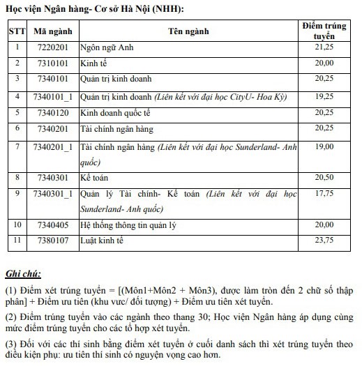 Điểm chuẩn Học viện Ngân hàng (cơ sở Hà Nội)