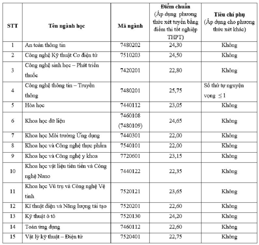 Mức điểm chuẩn mà Đại học Bách khoa Hà Nội công bố dựa vào kết quả thi tốt nghiệp từ 23.03 đến 28.29. trong đó ngành Công nghệ thông tin – Kỹ thuật máy tính có đầu vào cao nhất với mức điểm chuẩn là 28.28 điểm, tăng 0.19 so với năm ngoái. Hai ngành có điểm chuẩn cao tiếp theo là Kỹ thuật Điều khiển - Tự động hóa 27.61 và Công nghệ thông tin (Việt - Nhật) 27.25