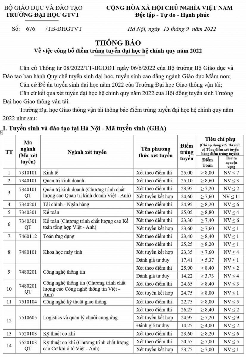 Trường Đại học Giao thông Vận tải vừa công bố điểm chuẩn xét tuyển năm 2022. Xét theo điểm thi tốt nghiệp THPT, ngành Logistics và quản lí chuỗi cung ứng có điểm chuẩn cao nhất, 26,25 điểm. Ngành Kỹ thuật xây dựng công trình giao thông có điểm chuẩn thấp nhất toàn trường, 17 điểm. Điểm chuẩn ngành Công nghệ thông tin là 25.90 điểm.
