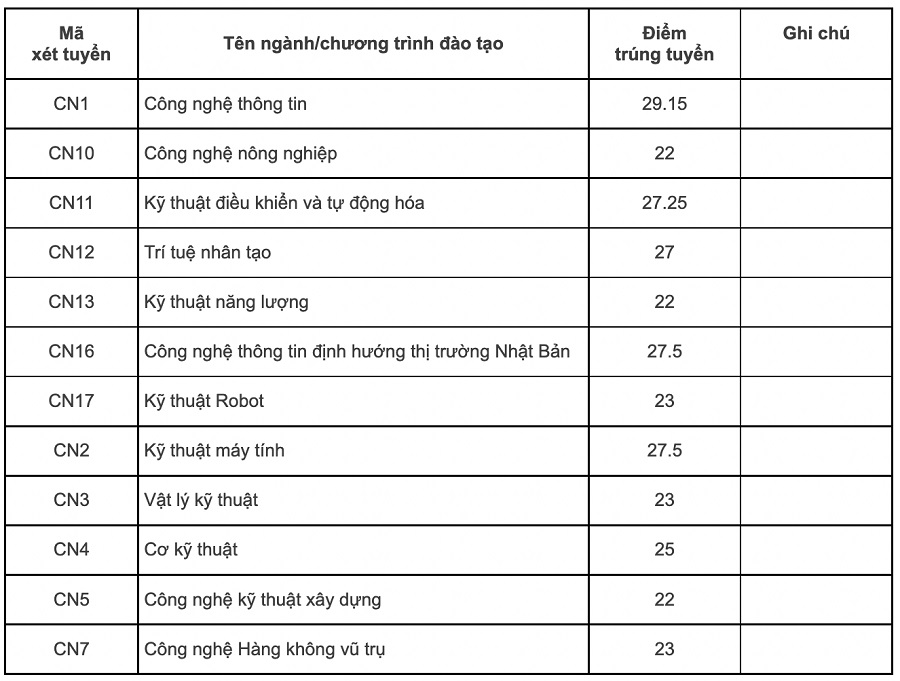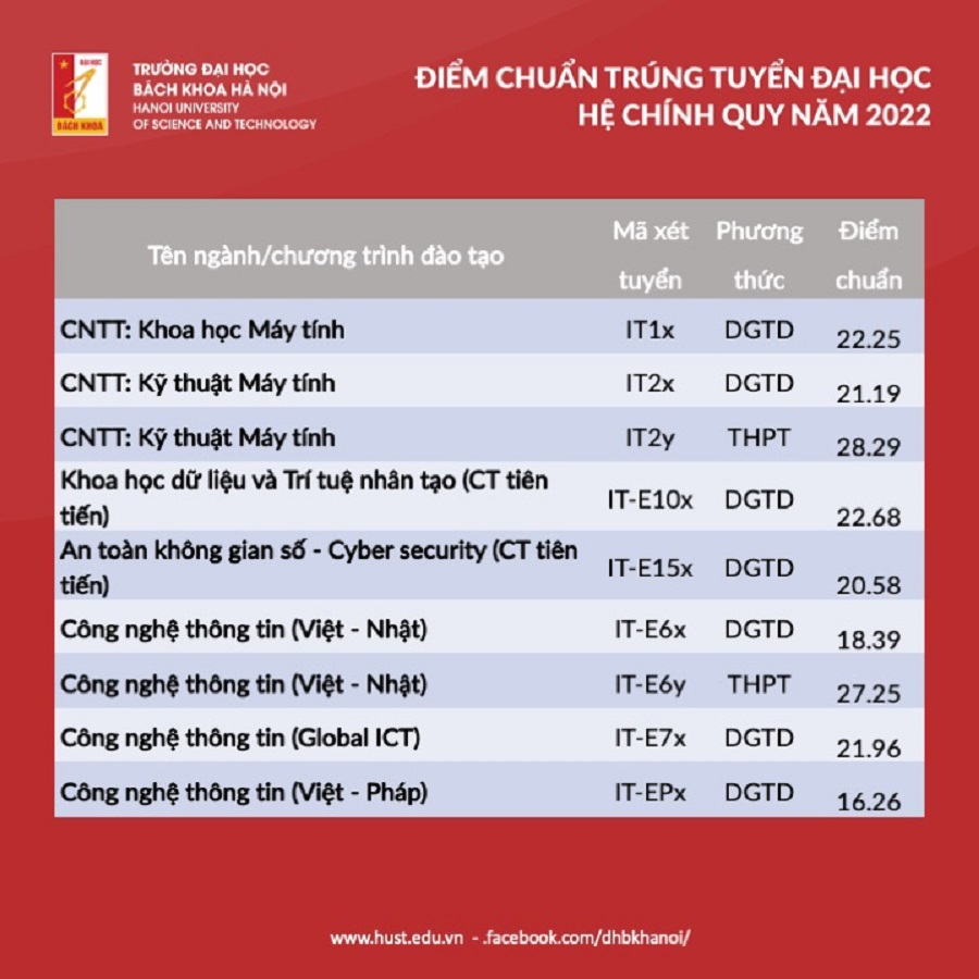 Trường Đại học Công nghệ, Đại học Quốc gia Hà Nội công bố điểm chuẩn năm 2022. Khoa Công nghệ thông tin của Trường Đại học Công nghệ, Đại học Quốc gia Hà Nội có mức điểm chuẩn cao nhất là 29,15 điểm. Chi tiết điểm chuẩn các ngành như sau: