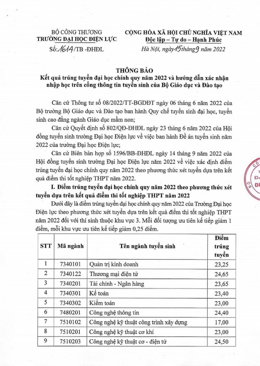 Trường Đại học Điện lực vừa công bố điểm chuẩn trúng tuyển năm 2022 theo phương thức xét tuyển bằng điểm thi tốt nghiệp THPT. Theo đó, ngành Thương mại Điện tử có điểm chuẩn cao nhất, 24,65 điểm. Ngành thấp điểm nhất là ngành Công nghệ Kỹ thuật môi trường với 16 điểm. Ngành Công nghệ thông tin năm nay lấy 24.40 điểm.