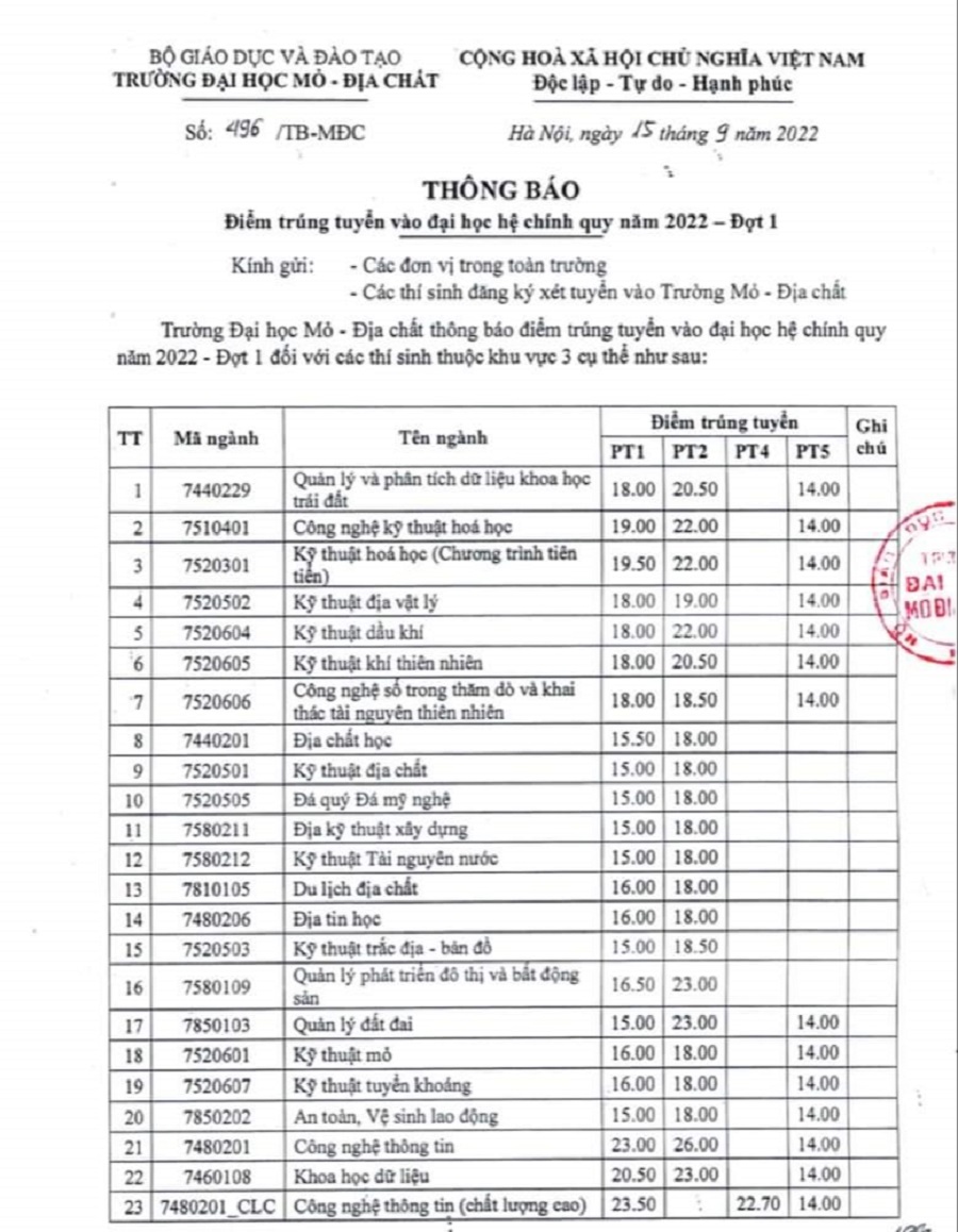 Trường Đại học Mỏ - Địa chất vừa công bố điểm chuẩn năm 2022. Mức điểm năm nay của nhà trường dao động từ 15-23,5 điểm.