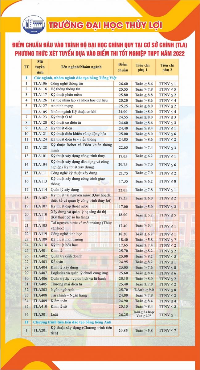 Giống với Đại học Bách khoa Hà Nội, năm nay Công nghệ thông tin cũng là ngành có chuẩn cao nhất của Trường Đại học Thủy lợi với mức điểm là 26.6 điểm trong khi ở năm 2021, ngành Công nghệ thông tin của trường lấy 25.25 điểm.