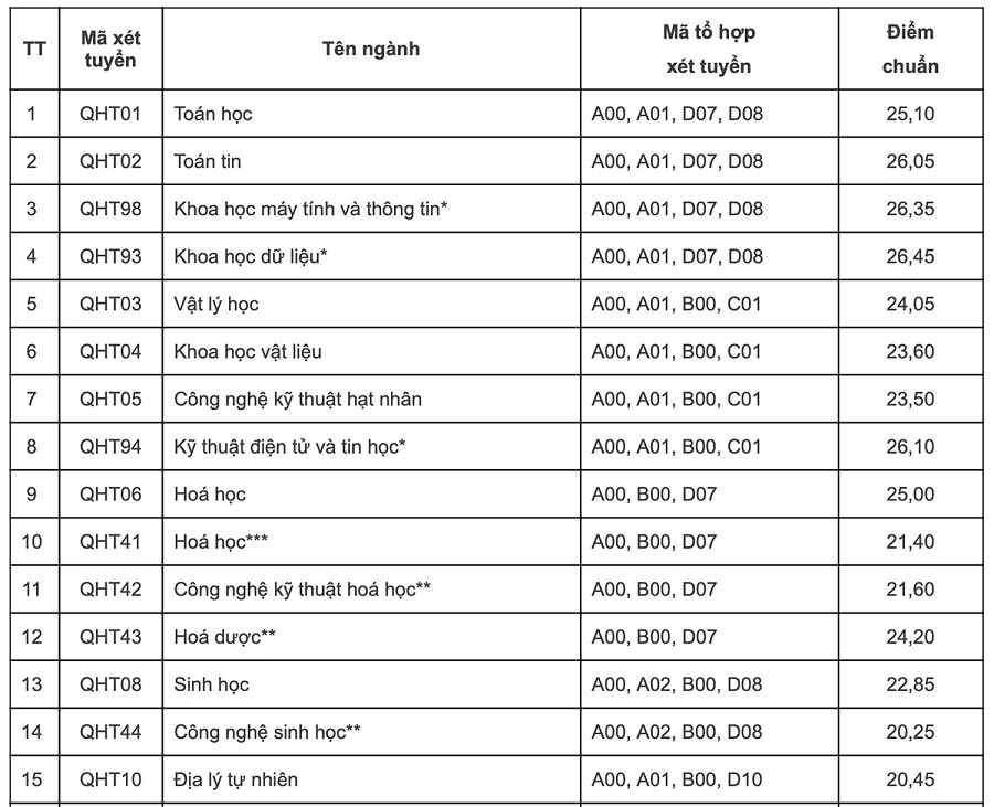 Điểm chuẩn Trường Đại học Khoa học Tự nhiên (HUS), Đại học Quốc gia Hà Nội, dao động 20-26.45, trong đó ngành Khoa học dữ liệu lấy cao nhất. Ngành Công nghệ thông tin lấy 26.35 điểm.