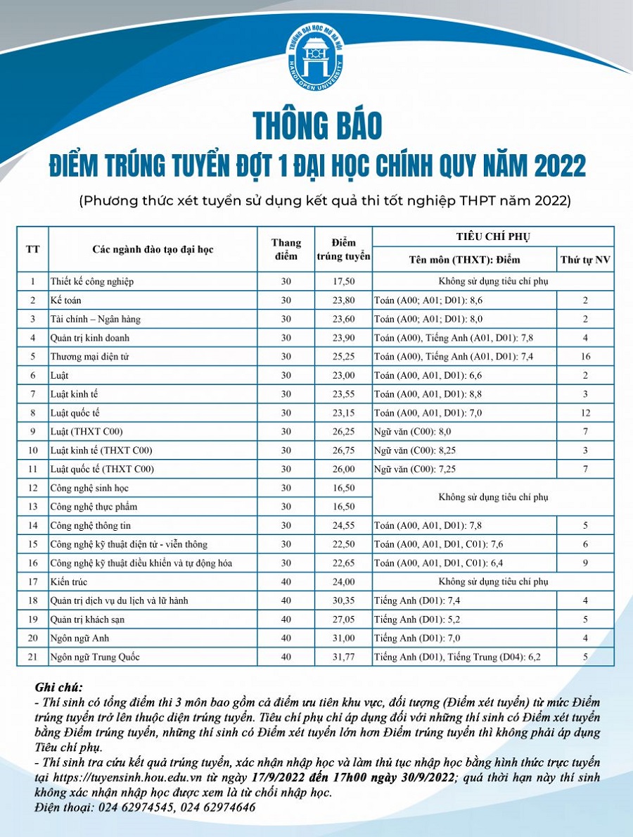 Trường Đại học Mở Hà Nội thông báo Điểm trúng tuyển đợt 1 đại học chính quy năm 2022. Theo đó, thí sinh có tổng điểm thi 3 môn bao gồm cả điểm ưu tiên khu vực, đối tượng (Điểm xét tuyển) từ mức Điểm trúng tuyển trở lên thuộc diện trúng tuyển. Tiêu chí phụ chỉ áp dụng đối với những thí sinh có Điểm xét tuyển bằng Điểm trúng tuyển, những thí sinh có Điểm xét tuyển lớn hơn Điểm trúng tuyển thì không phải áp dụng Tiêu chí phụ.