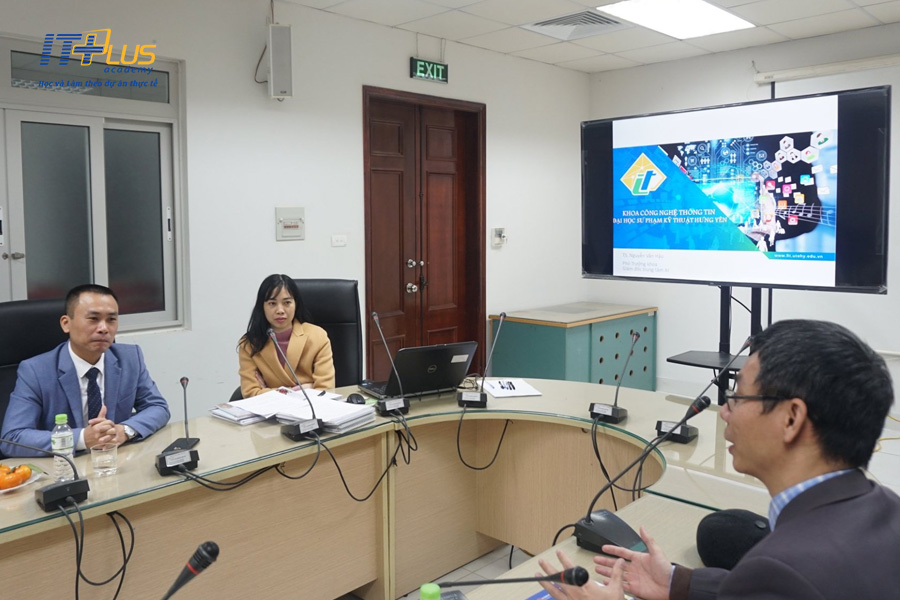 Buổi gặp mặt và thảo luận hợp tác diễn ra rất sôi nổi hào hứng. Đại diện ITPlus Academy, ông Hoàng Văn Thắng phát biểu: ITPlus vô cùng vinh hạnh được đón tiếp khoa CNTT - trường ĐH Sư phạm Kỹ thuật Hưng Yên ngày hôm nay. Như mọi người biết thì ITPlus là đơn vị đào tạo chuyên nghiệp công nghệ thông tin và thiết kế đồ họa với phương châm hợp tác chặt chẽ với các trường, doanh nghiệp. Trải qua quá trình hình thành và phát triển, ITPlus đã có 3 cơ sở tại Hà Nội, đạt được thành tựu vô giá “Danh hiệu Sao Khuê” 3 năm liên tiếp 2017, 2018, 2019 và giải thưởng “Chuyển đổi số năm 2019”.