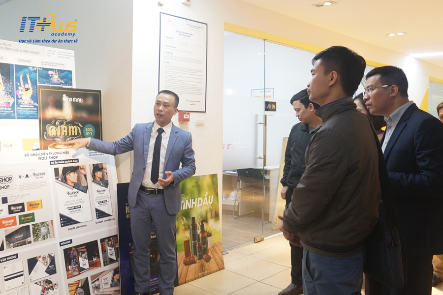 Trước tiên, ông Hoàng Văn Thắng - giám đốc ITPlus dẫn đoàn đại biểu của khoa CNTT - trường ĐH Sư phạm Kỹ thuật Hưng Yên tham quan cơ sở vật chất và giới thiệu các bộ sản phẩm học viên của ITPlus. Chia sẻ về sản phẩm học viên, giám đốc ITPlus rất tự hào bởi đây là yếu tố cốt lõi của ITPlus. Sau khi học thiết kế đồ họa chuyên nghiệp ở đây, các bạn học viên có thể làm việc ngay cho các doanh nghiệp với khả năng thiết kế bộ nhận diện thương hiệu ấn tượng, độc đáo, hiệu quả thực tế cao.