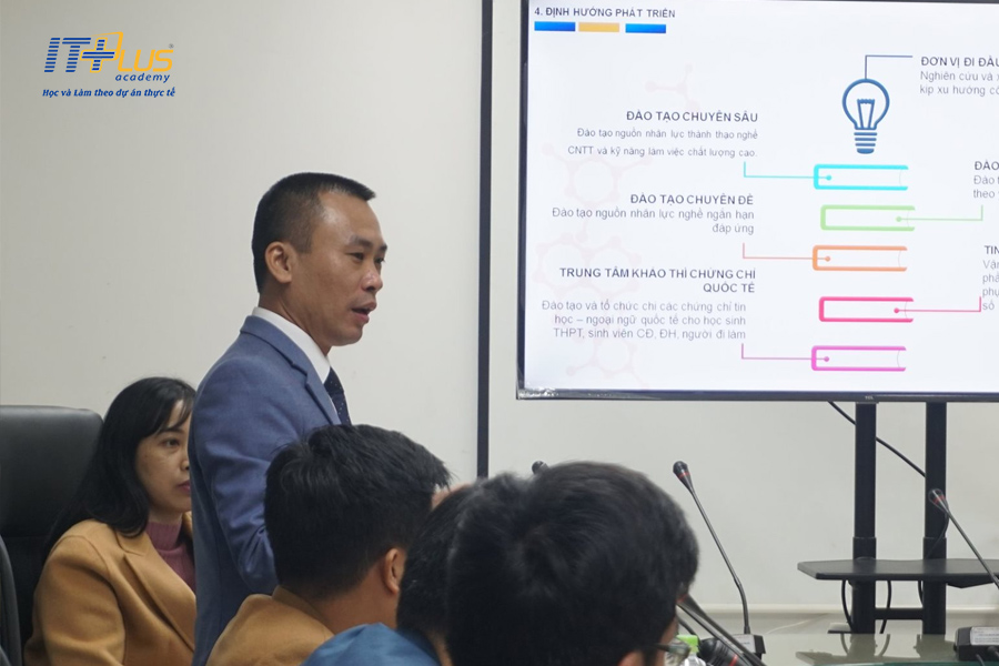 Về phía khoa CNTT - trường ĐH Sư phạm Kỹ thuật Hưng Yên, TS. Nguyễn Văn Hậu - Phó trưởng khoa CNTT - Giám đốc trung tâm AI cũng có đôi lời phát biểu: “Chúng tôi cũng rất vinh hạnh khi được làm việc với ITPlus hôm nay. ITPlus thực sự đang tạo ra rất nhiều giá trị cho xã hội với slogan đào tạo: “Học và làm việc theo dự án thực tế”. Buổi gặp mặt này chính là cơ hội cho cả 2 bên thảo luận các dự án hợp tác lâu dài.”