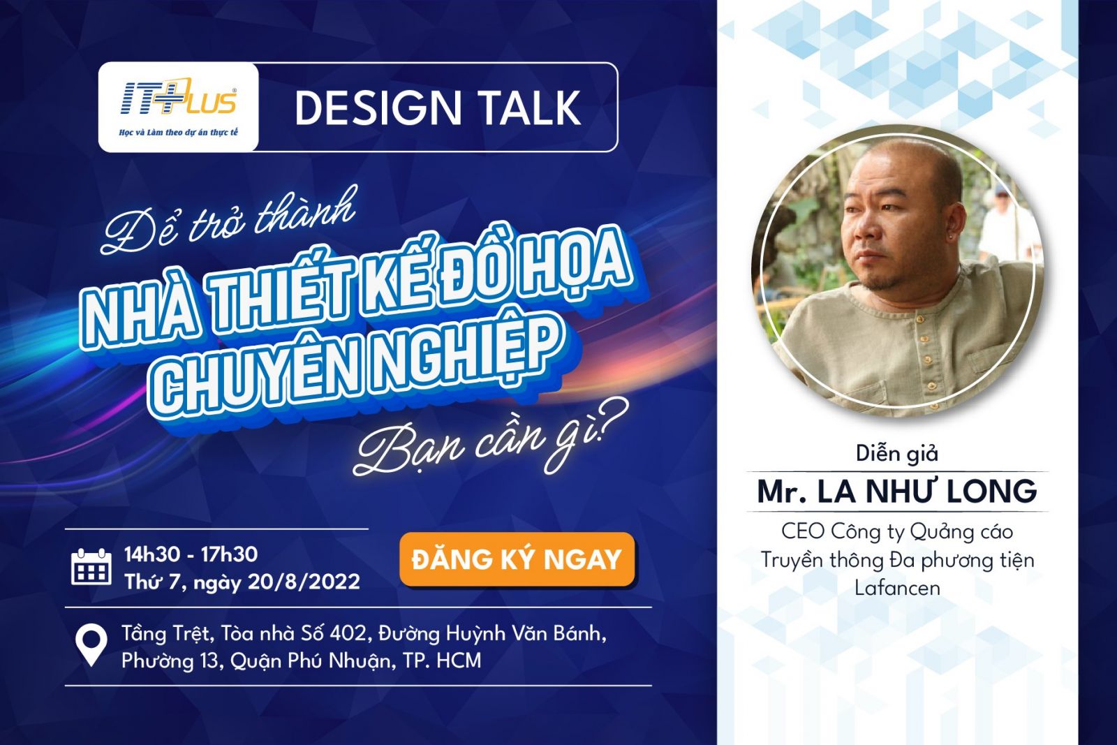 Nhằm giúp các bạn trẻ có cái nhìn tổng quan về nghề Thiết kế, Designer, gặp mặt và chia sẻ cùng chuyên gia thiết kế đồ họa với kinh nghiệm hơn 30 năm. ITPlus Sài Gòn trân trọng kính mời các bạn tham gia buổi gặp mặt và trao đổi “ĐỂ TRỞ THÀNH NHÀ THIẾT KẾ ĐỒ HOẠ CHUYÊN NGHIỆP BẠN CẦN GÌ ?” với thầy La Như Long – Giảng viên thiết kế đồ họa ITPlus – CEO Công ty Quảng cáo Truyền thông Đa phương tiện Lafancen.