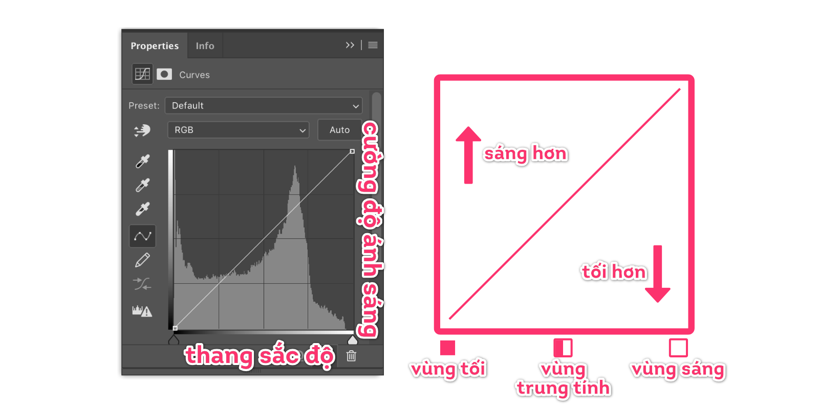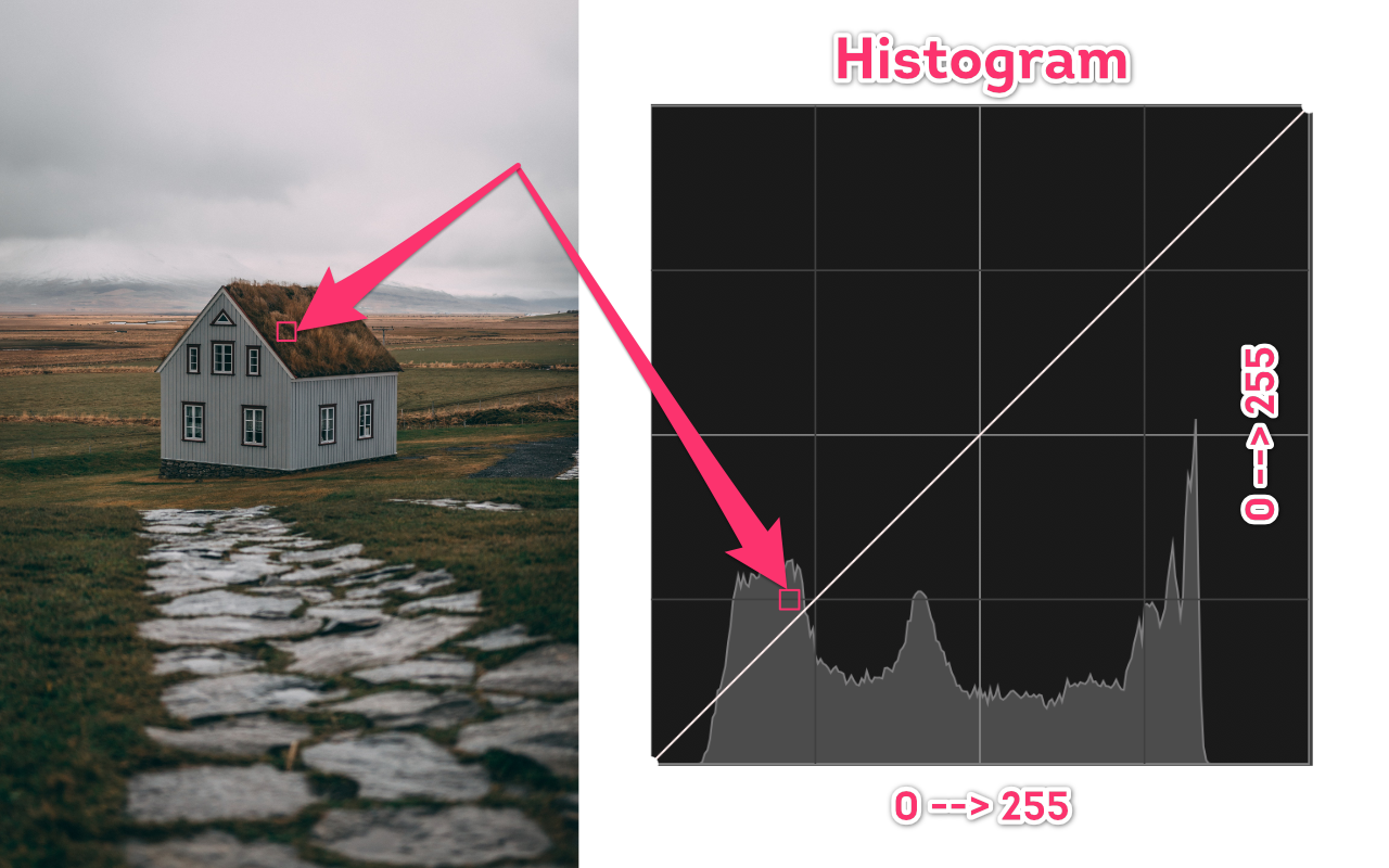Nhìn vào đồ thị Histogram, vùng điểm ảnh nằm ở bên trái đồ thị sẽ gồm các vùng điểm ảnh tối (dark pixels - shadows), những điểm ảnh ở khoảng giữa được gọi là vùng trung tính (midtones), và những điểm ảnh nằm bên phải sẽ là những vùng điểm ảnh sáng (bright pixels - highlights). Nếu những điểm ảnh này càng đi lên, thì đồng nghĩa cường độ ánh sáng của chúng tăng lên, tức sáng hơn, và tương tự nếu đi xuống thì những điểm ảnh sẽ bị tối hơn.