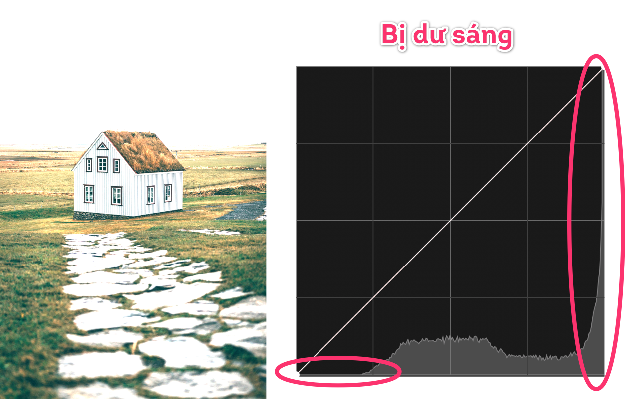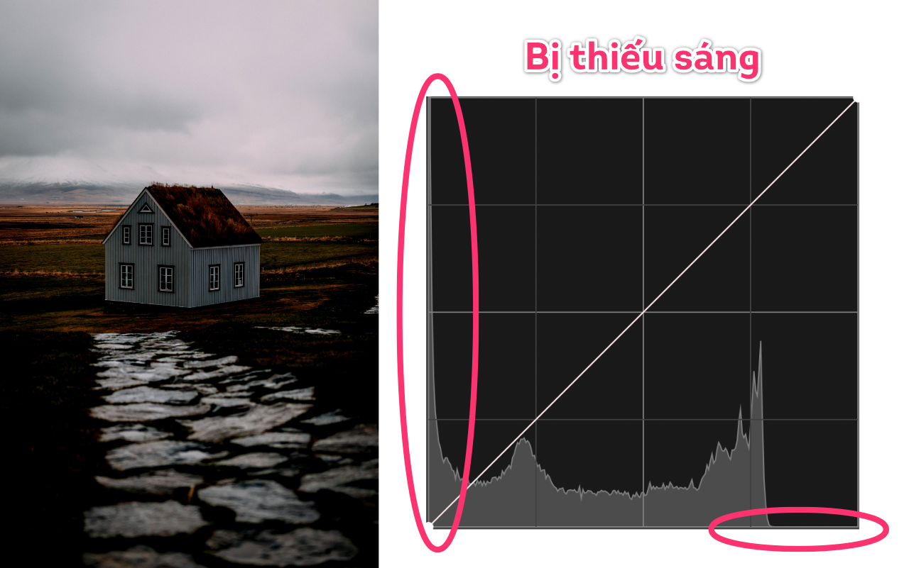 Dựa vào đồ thị Histogram, ta có thể biết được những tính chất cơ bản nhất của một bức ảnh. Lấy ví dụ hai tấm hình bên dưới, trường hợp ảnh bị thiếu sáng, các điểm ảnh bị phân bố dồn về phía bên trái (vùng tối) của trục ngang đồ thị. Và ngược lại ở bức ảnh bị dư sáng, các điểm ảnh bị phân bố dồn về phía bên phải, chúng ta có thể thấy ở vùng sắc độ phía bên trái (vùng chứa các giá trị thể hiện sắc đen) hầu như không có điểm ảnh nào.