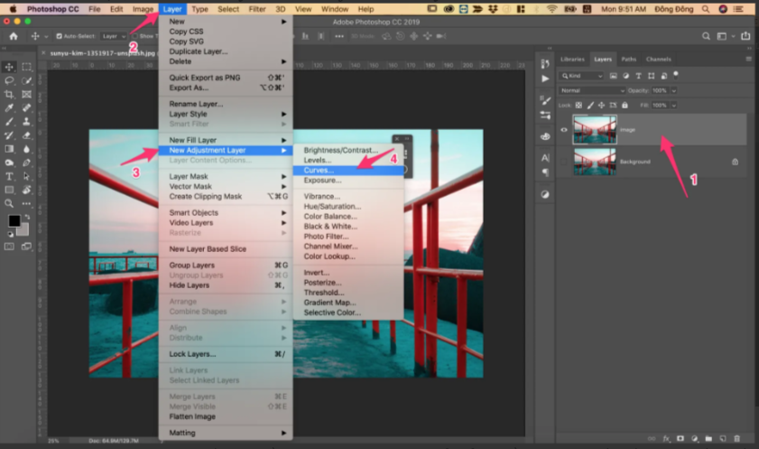 Để tạo một Adjustment Curves Layer, đầu tiên ta click trái chuột vào Layer cần được tạo, sau đó vào Layer > New Adjustment Layer > Curves.