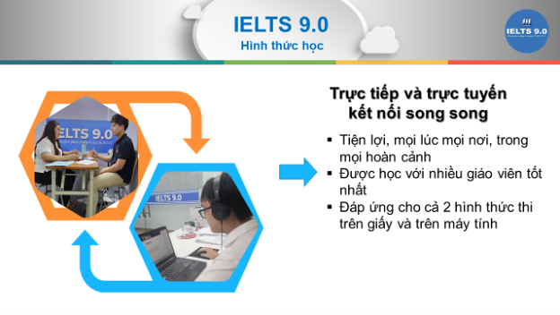 Tăng thêm kỹ năng máy tính khi học trực tuyến, đáp ứng kỳ thi IELTS trên máy tính để biết điểm nhanh hơn (chỉ sau 1 ngày) và được thi lại một kỹ năng nếu muốn thay vì thi trên giấy (sau 13 ngày mới có kết quả)