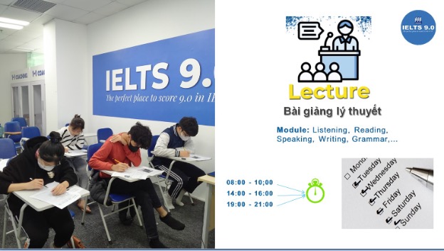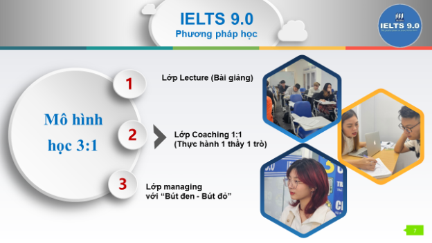 Khác với cách học truyền thống chỉ có 1 lớp học lý thuyết đại trà, thì tại IELTS 9.0, các học viên sẽ được học cá nhân hóa, trải qua 3 mô hình lớp học được gọi là 3 trong 1 gồm Lecture -Bài giảng lý thuyết, Coaching 1:1 (thực hành 1 thầy 1 trò) và lớp thứ 3 là Managing ‘Bút đen- bút đỏ” ghi nhớ bài ngay tại chỗ.
