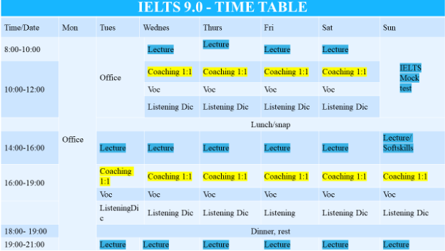 Mỗi học viên được coach riêng với giáo viên trực tiếp hoặc trực tuyến từ 20-30 phút, có thể linh hoạt lựa chọn khung giờ sáng từ 10:00- 12:00 và chiều từ 16:00 – 19:00.