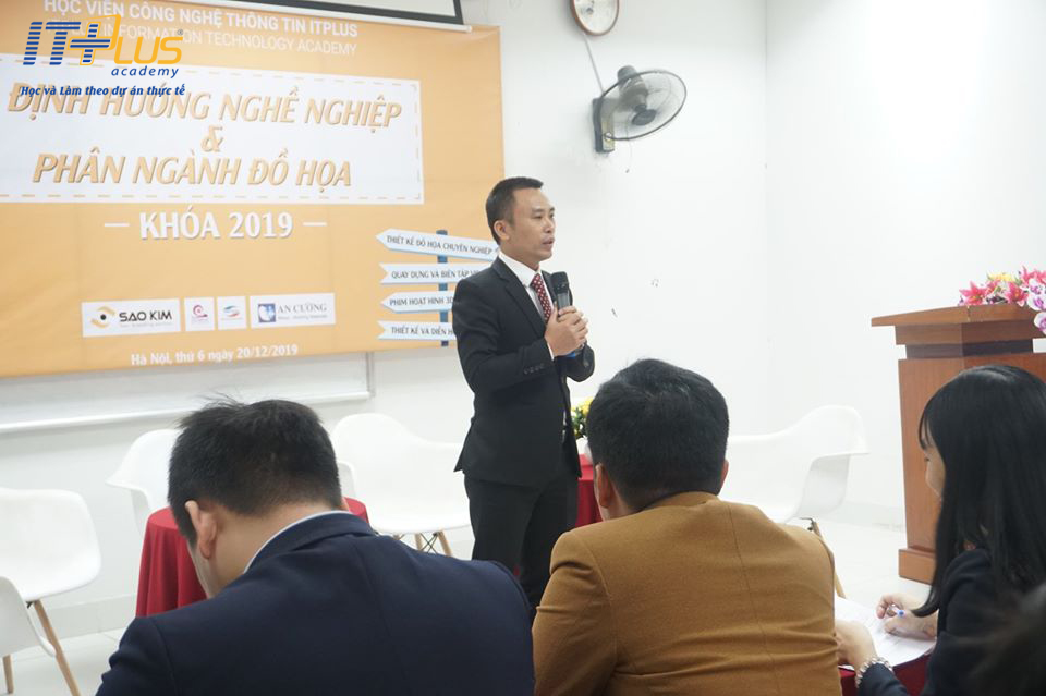 Tiếp nối chương trình là bài phát biểu của Thầy Lưu Kim Khánh giới thiệu chuyên ngành và chương trình đào tạo: “Tại ITPlus sẽ có nhiều chuyên ngành cho các bạn lựa chọn. Thứ nhất là Đồ họa chuyên nghiệp; Quay dựng và biên tập video; Hoạt hình 2D, 3D và quảng cáo; Thiết kế và diễn họa nội thất”. “Ngành nghề nào cũng vất vả, không có ngành nghề nào là nhàn rỗi, thành công sẽ đến với những người biết nỗ lực”.