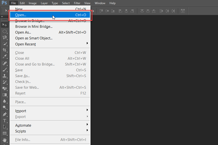 Bước này rất đơn giản thôi, bạn chỉ cần chọn File => Open hoặc nhấn tổ hợp phím tắt Crtl + O sau đó chọn file ảnh mà mình muốn chèn logo từ máy tính. Bạn có thể tham khảo hình minh họa dưới đây để thực hiện theo.