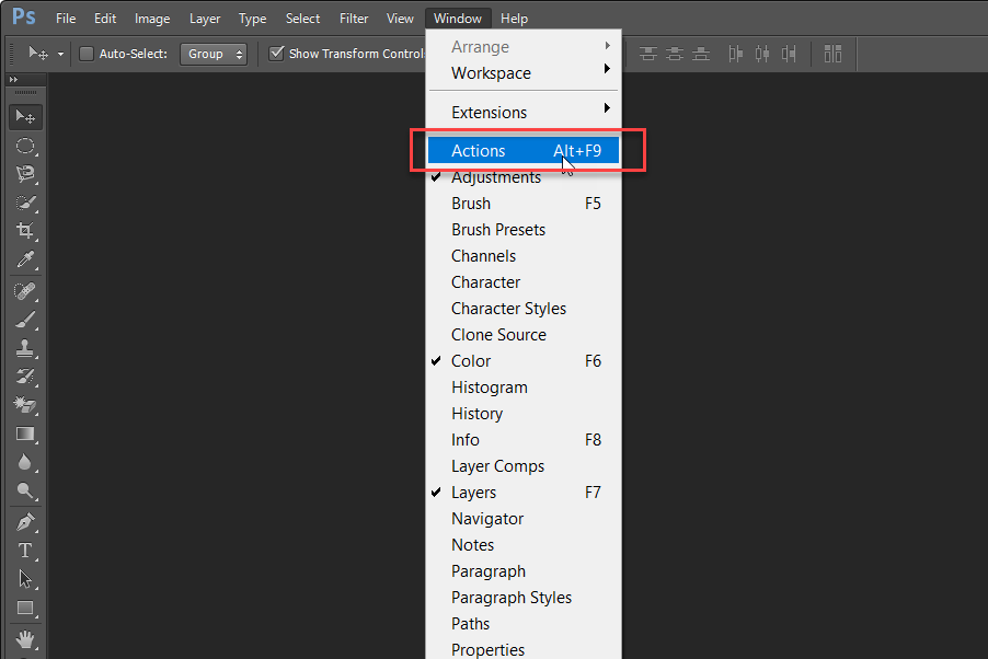 Bước 2: Khởi động tính năng Actions trong Photoshop