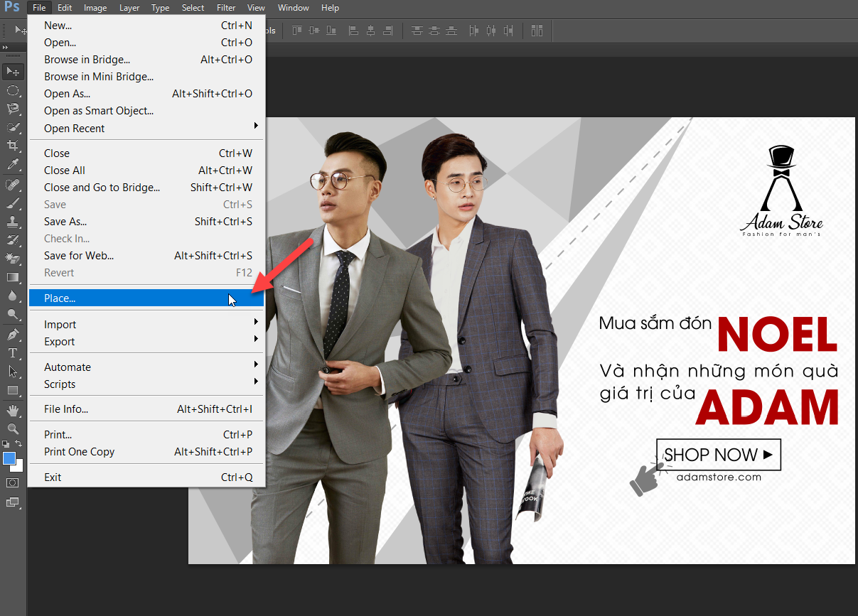 Sau bước 3, Actions của bạn đã được ghi lại cũng có nghĩa là để chèn logo một cách hàng loạt bạn cần thực hiện việc chèn logo mẫu cho một ảnh bất kỳ trước. Bạn hãy chọn File => Place hoặc Place Linked tùy theo các phiên bản Photoshop.