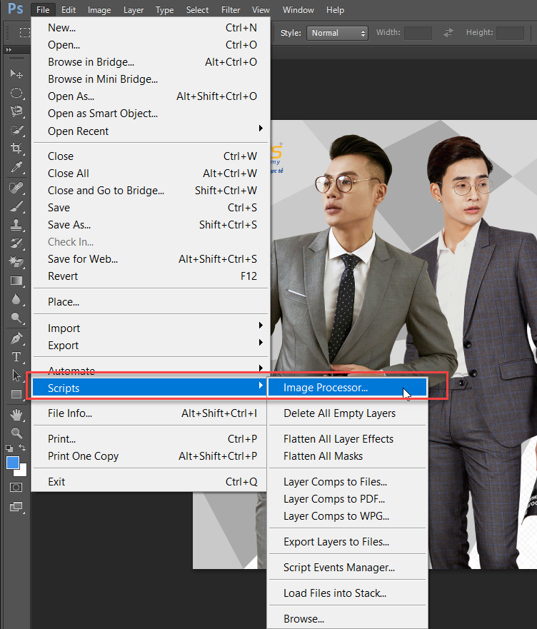 Hãy thực hiện lệnh File => Scripts => Image Processor để bảng Image Processor hiện lên giúp bạn tùy chọn Folder chứa các ảnh muốn chèn logo.