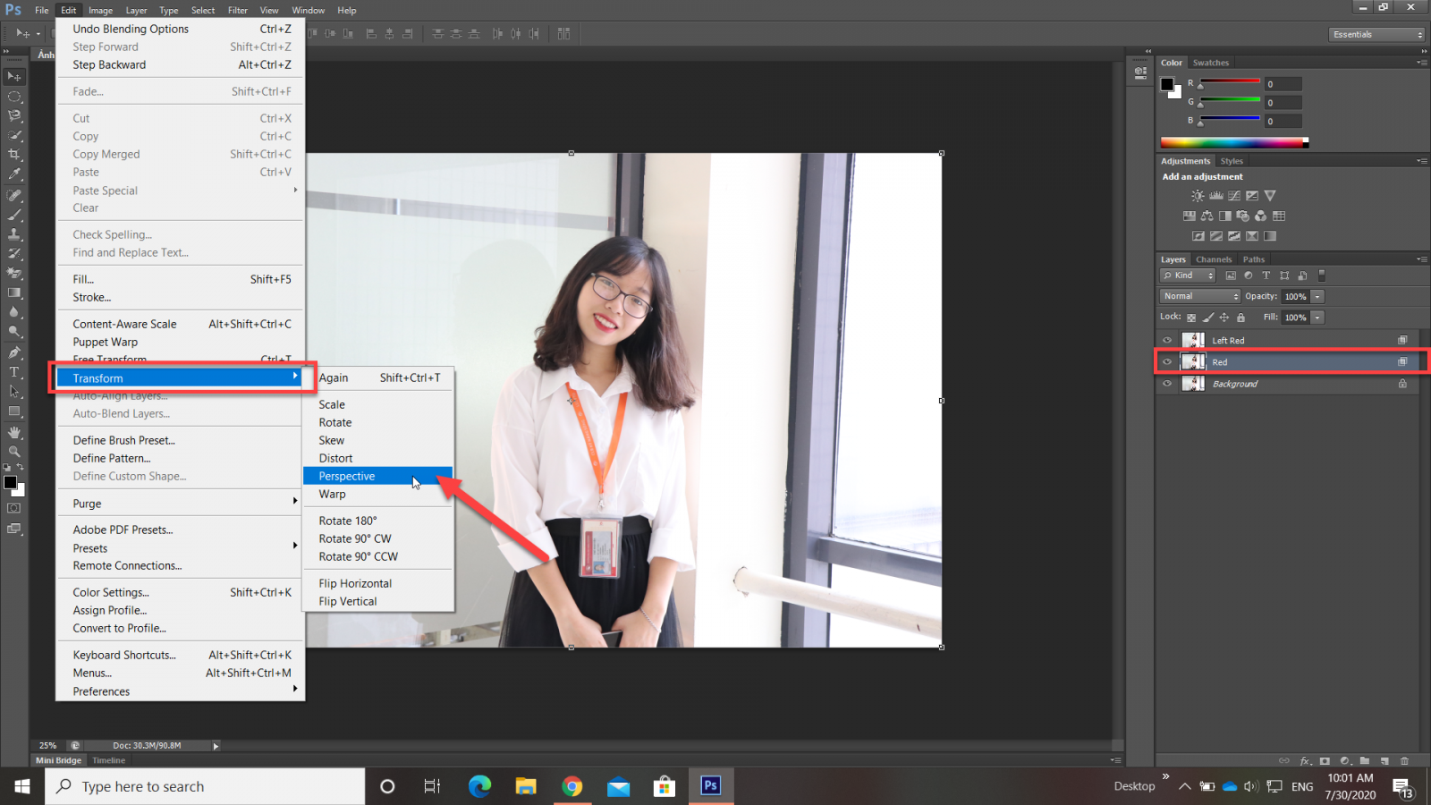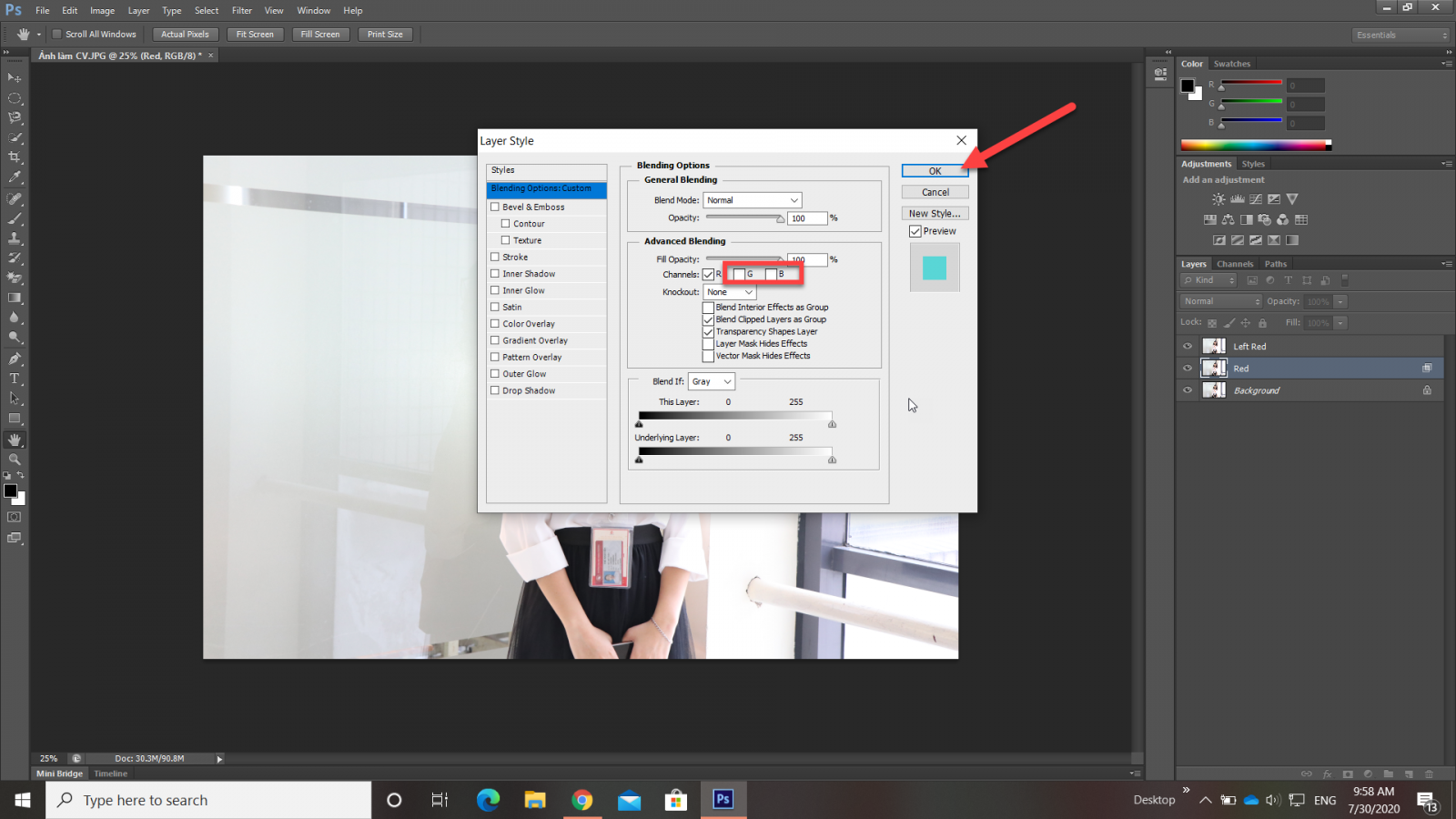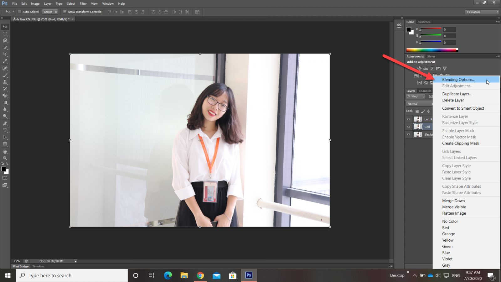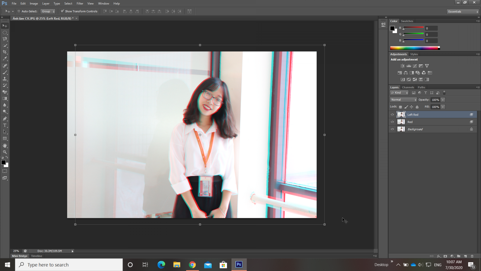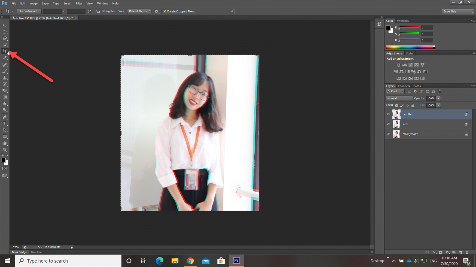 Hãy sử dụng công cụ Move Tool (phím tắt V) để di chuyển Layer Left Red trùng khớp hình người ở giữa với Layer Red. Ta được ảnh như hình minh họa dưới đây.