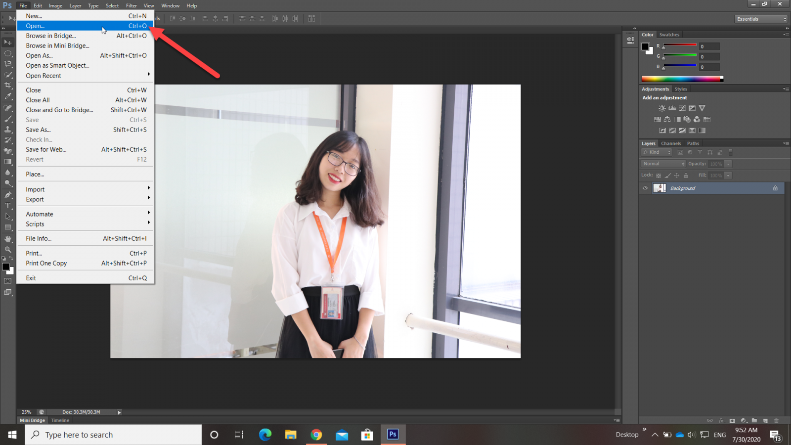 Trên thanh Menu phía trên cùng hãy click chuột vào File => Open sau đó lựa chọn tấm ảnh từ bộ nhớ máy tính.
