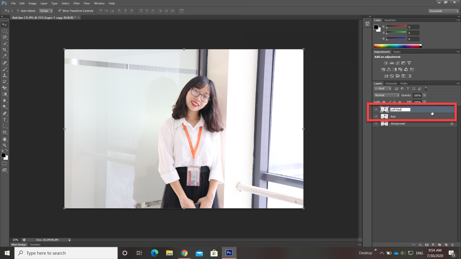 Tại bước này bạn chỉ cần nhấn Ctrl + J hai lần liên tiếp để nhân 3 layer background. Hai layer mới sẽ xuất hiện ngay lập tức tại phía bảng layer bên tay phải giao diện Photoshop. Sau khi có được 2 layer mới, bạn hãy đổi tên chúng bằng cách nháy đúp chuột và phần tên để chỉnh sửa. Layer phía dưới đổi thành “Red”, layer phía trên đổi thành “Left Red”. Thực chất bước này không làm ảnh hưởng đến kết quả của sản phẩm, tuy nhiên, thay đổi tên cho layer sẽ giúp bạn dễ dàng quản lý các đối tượng mà không bị nhầm lẫn.