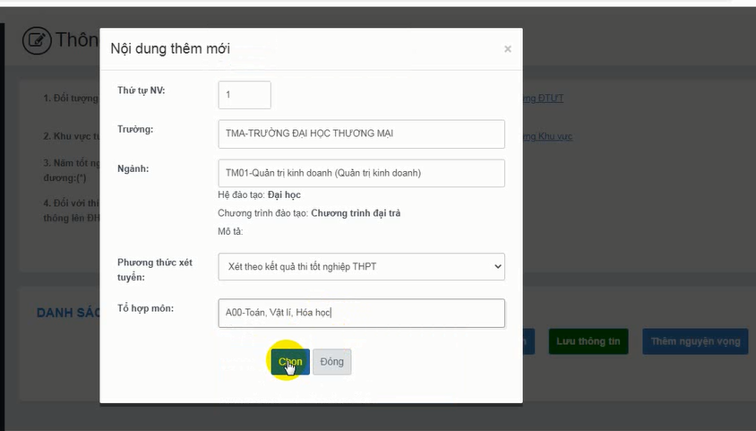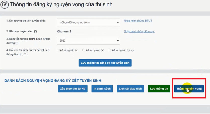 Bước 3: Thêm nguyện vọng đăng ký xét tuyển sinh