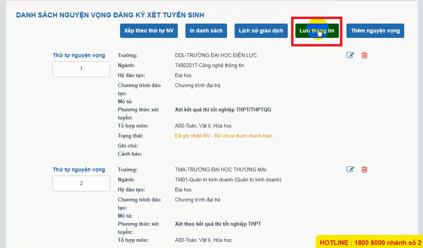 Sau đó nhấn vào nút: Lưu thông tin đăng ký xét tuyển sinh