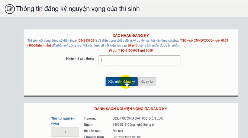 Sau khi gửi đến tổng đài 6058, hệ thống sẽ gửi cho các em mã xác thực. Các em nhập mã xác thực vào ô trống để lưu thông tin đăng ký nguyện vọng.