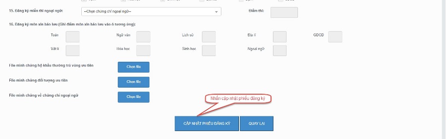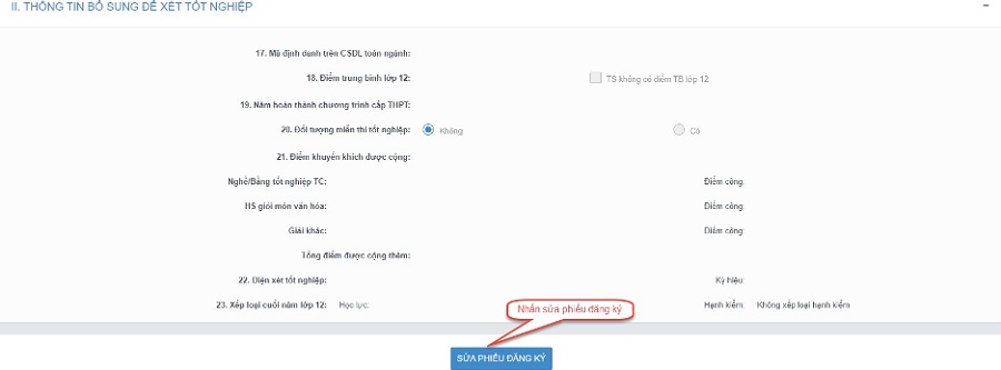 Bước 2: Sau khi sửa các thông tin, nhấn cập nhật phiếu đăng ký