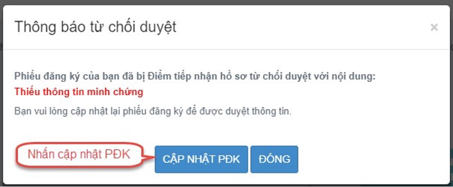 Sửa phiếu đăng ký khi điểm tiếp nhận từ chối duyệt