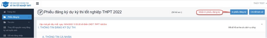 Thí sinh đăng nhập tài khoản, chọn Phiếu đăng ký => Chi tiết phiếu đăng ký => In phiếu đăng ký