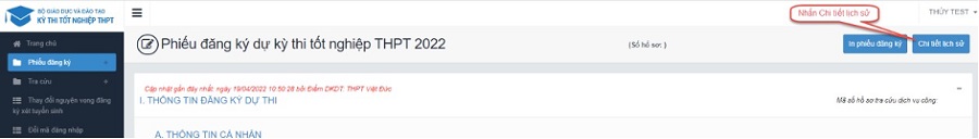 Bước 1: Thí sinh đăng nhập tài khoản, chọn Phiếu đăng ký => Chi tiết phiếu đăng ký=> Chi tiết lịch sử.