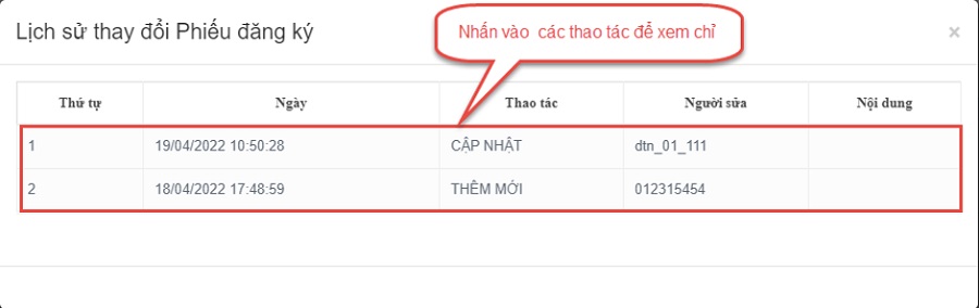 Bước 2: Nhấn vào các thao tác để xem chi tiết lịch sử phiếu