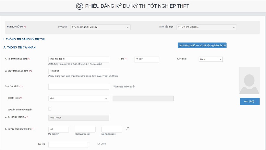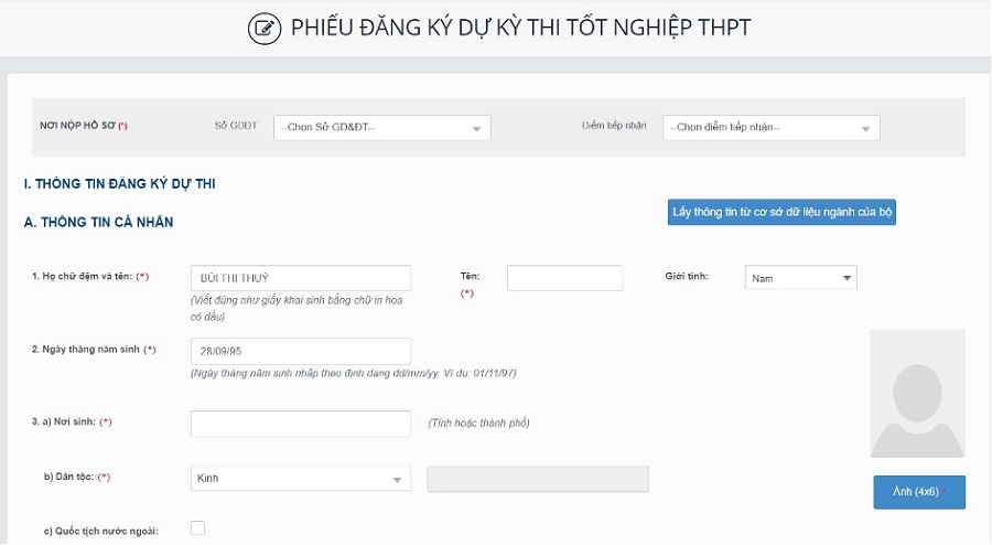 Bước 2: Sau khi đổi mã đăng nhập thành công, màn hình nhập phiếu đăng ký trực tuyến hiển thị. Thí sinh nhập chính xác các thông tin trên phiếu đăng ký