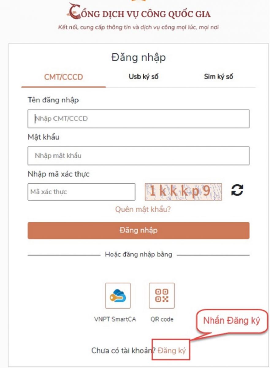 Bước 2: Nếu đã có tài khoản dịch vụ công quốc gia thì thực hiện đăng nhập, nếu chưa có thì nhấn vào Đăng ký