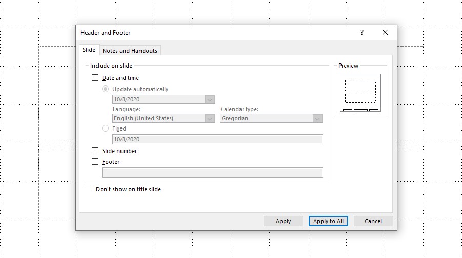 Ngoài ra, nếu bạn muốn xóa toàn bộ phần đánh dấu trang thì vào lại Header & Footer, bỏ tích Slide Number rồi nhấn Apply hoặc Apply to All đều được.