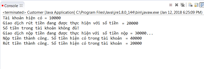 taiKhoan -= soTienRut; System.out.println("Rút tiền thành công. Số tiền hiện có trong tài khoản = " + taiKhoan); }