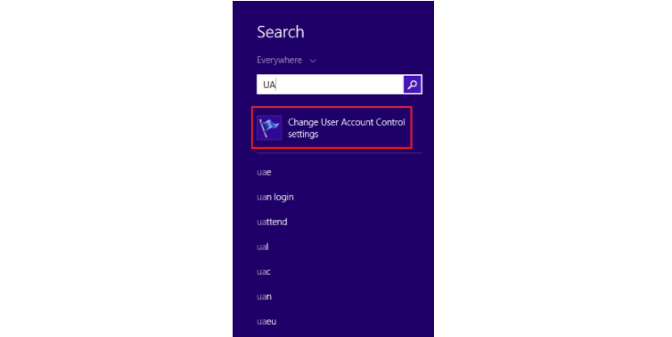 Bước 1: Các bạn khởi động Change User Acount Control Setting bằng cách nhấn vào cửa sổ Windows và gõ UAC.