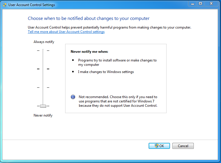 Bước 2: Thiết lập đưa về Never Notify để không hiện thông báo khi chạy các chương trình có sự can thiệp vào hệ thống.