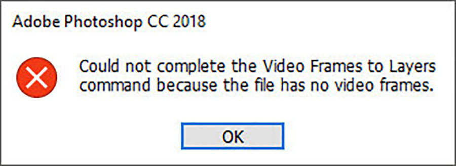 Could not complete the Video Frames to Layers command because the file has no video frames.