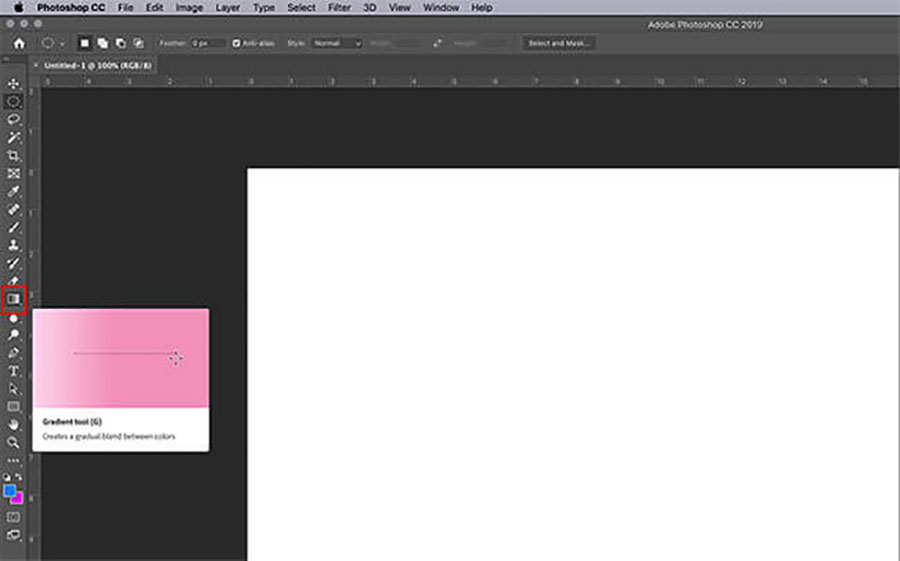 Bạn có thể mở mộ canvas có kích thước mặc định của Photoshop vì template này là tùy chỉnh. Sau khi kích hoạt Gradient, chọn hai màu bạn muốn trong gradient, sử dụng các mẫu màu ở dưới cùng của thanh công cụ.