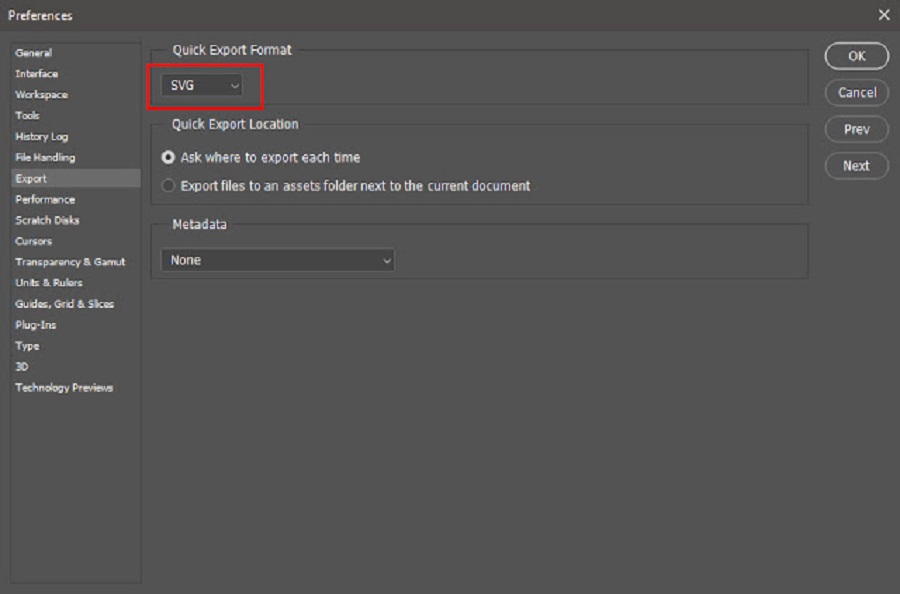 Nếu bạn muốn có quyền truy cập nhanh để xuất layer, nhóm layer hoặc artboard đã chọn, hãy truy cập File > Export > Export Preferences và từ danh sách drop-down Quick Export Format, hãy chọn SVG.