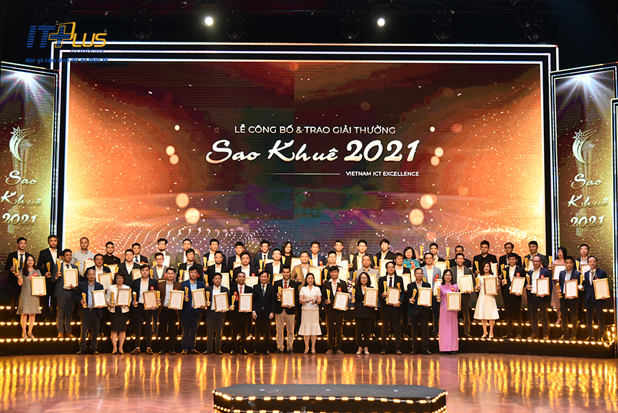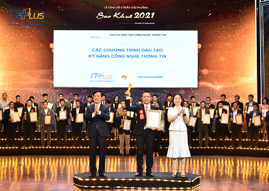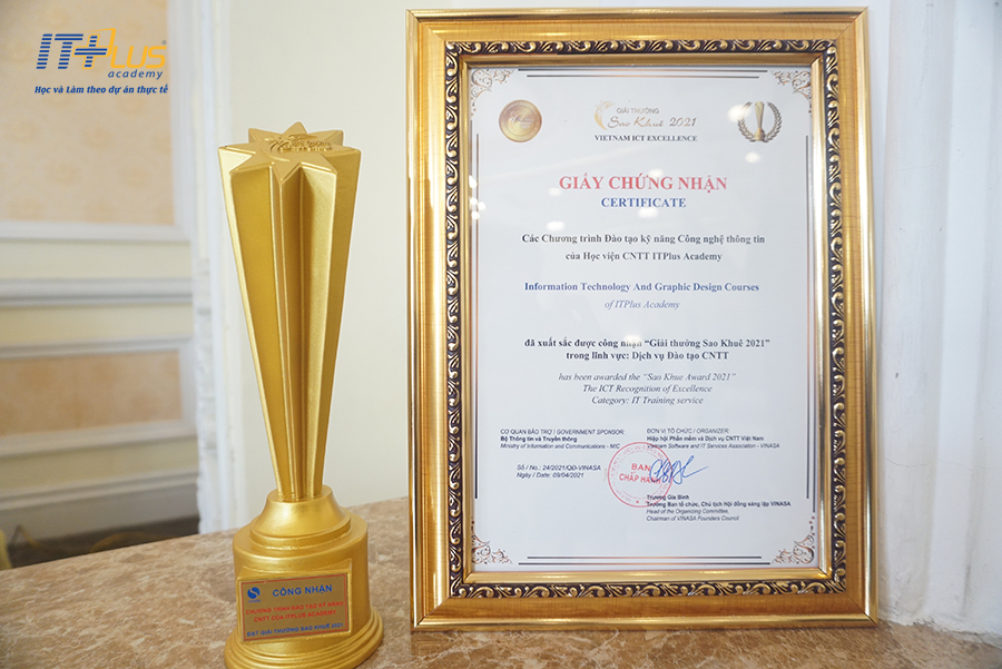 Cup vàng và Giấy chứng nhận Giải thưởng Sao Khuê 2021 dành cho "Các chương trình đào tạo Công nghệ thông tin và Thiết kế đồ họa - Truyền thông đa phương tiện - ITPlus Academy"