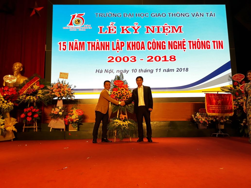 Đến với Lễ kỷ niệm ngày hôm nay, đại diện ITPlus Academy - Giám đốc Hoàng Văn Thắng đã có lẵng hoa tươi thắm gửi tặng Khoa. Chúc Khoa CNTT - Đại học Giao thông Vận tải sẽ ngày càng phát triển mạnh mẽ và bền vững hơn nữa, phát huy những thành tựu to lớn mà Khoa đã đạt được trong 15 năm qua.