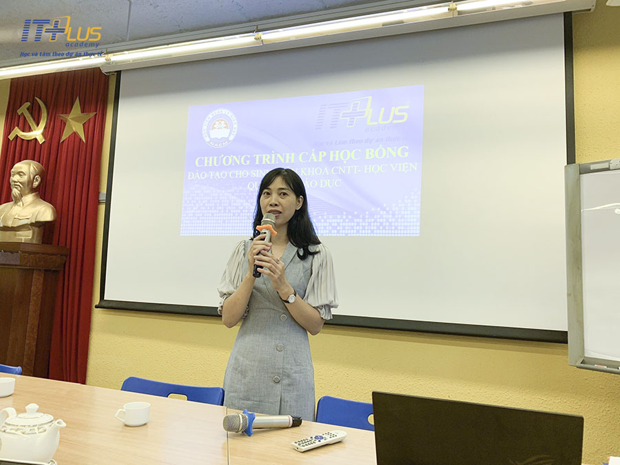 Tới tham dự chương trình, Đại diện cho ITPlus, cô Nguyễn Vân Anh - Trưởng phòng Đào tạo ITPlus đã lên có đôi lời phát biểu tới các bạn tân sinh viên K14. Cô nhấn mạnh: “Nhu cầu tuyển dụng Công nghệ thông tin hiện nay đang ở mức cao và vẫn sẽ tiếp tục tăng trong thời gian tới. Nguyên nhân là bởi để vận hành, phát triển các hệ thống thông tin, các ứng dụng công nghệ đòi hỏi phải một nguồn nhân lực rất lớn.” Từ đó cô bày tỏ hy vọng các bạn tân sinh viên K14 của Học viện Quản lý giáo dục sẽ tận dụng tốt xu hướng này và những suất học bổng của mình để có thể phát triển bản thân, lựa chọn được một công việc tốt trong tương lai. Cuối cùng, Đại diện của ITPlus đã gửi lời chúc mừng tốt đẹp nhất dành cho chương trình cũng như Học viện Quản lý giáo dục.