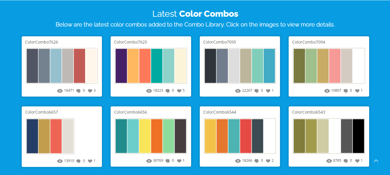 Những combo đó sẽ bao gồm 6 màu khác nhau kèm theo lượt xem cũng như bình luận của người dùng khác. Chỉ cần click chuột vào cách kết hợp ta mong muốn, các màu gốc sẽ xuất hiện kèm theo thông số chi tiết và cụ thể.