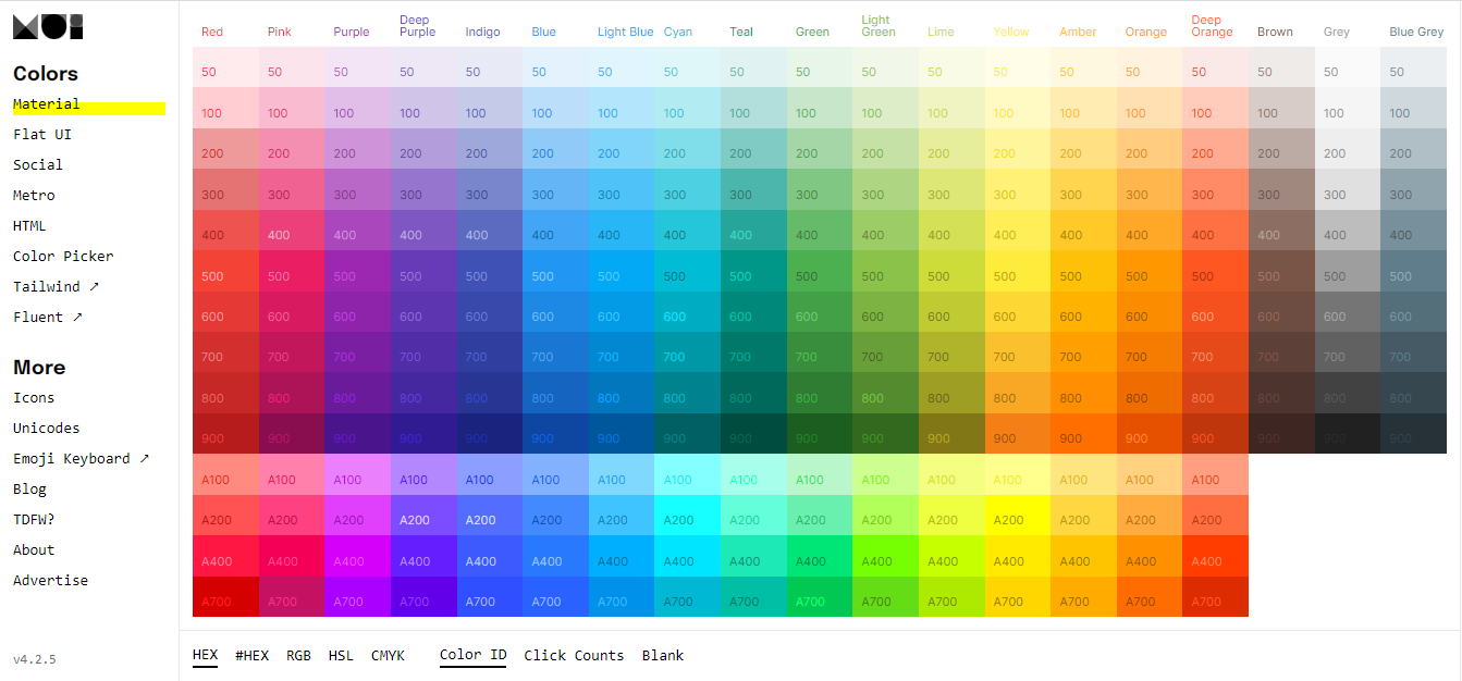 Material Design chính là chân ái dành cho các bạn yêu thích các dải màu palette. Ưu điểm của website là kho màu khổng lồ và cách sử dụng chúng rất dễ dàng. Khi thiết kế, bạn chỉ cần chọn màu yêu thích và paste mã màu này vào phần mềm đang sử dụng là được.